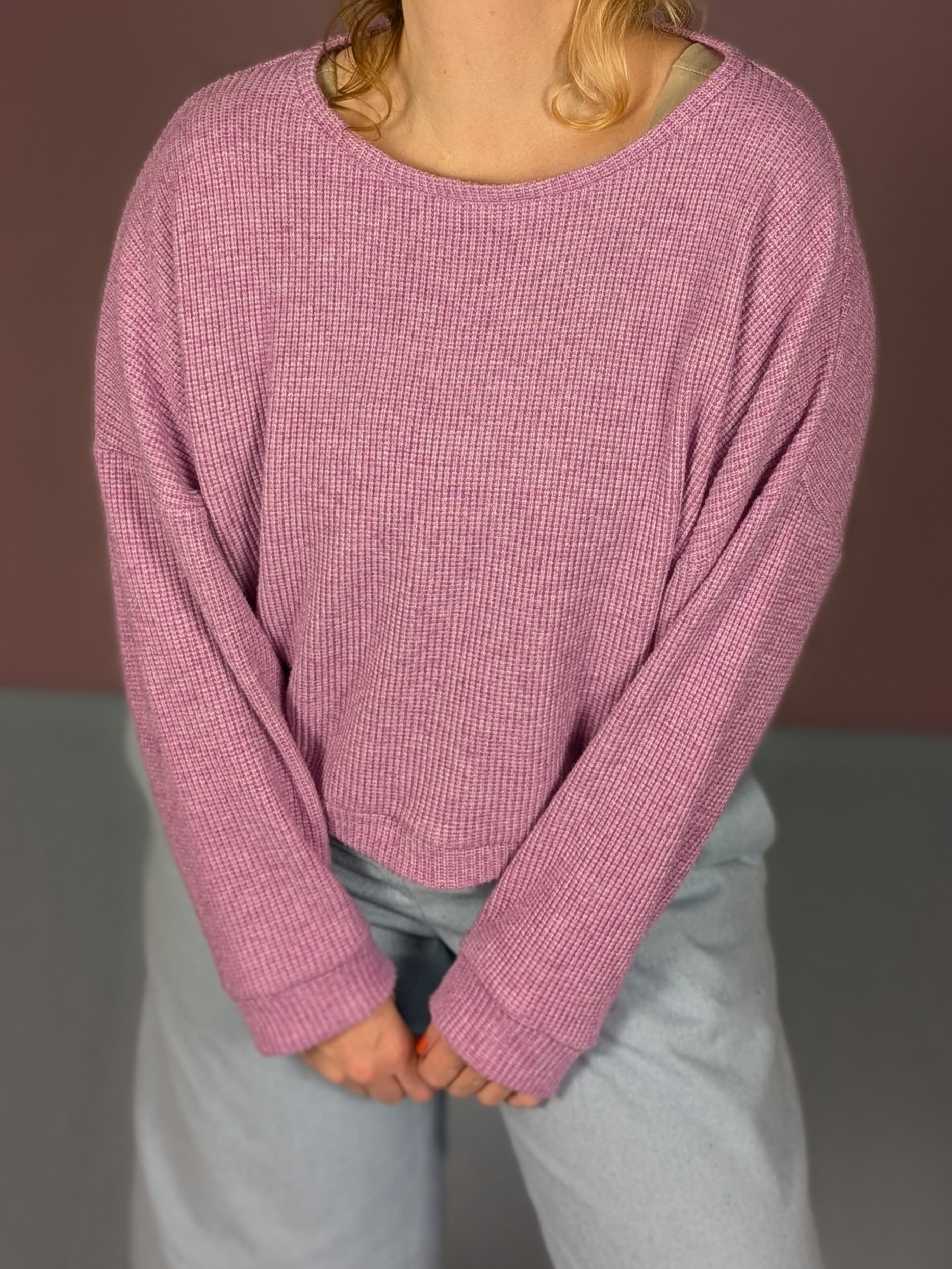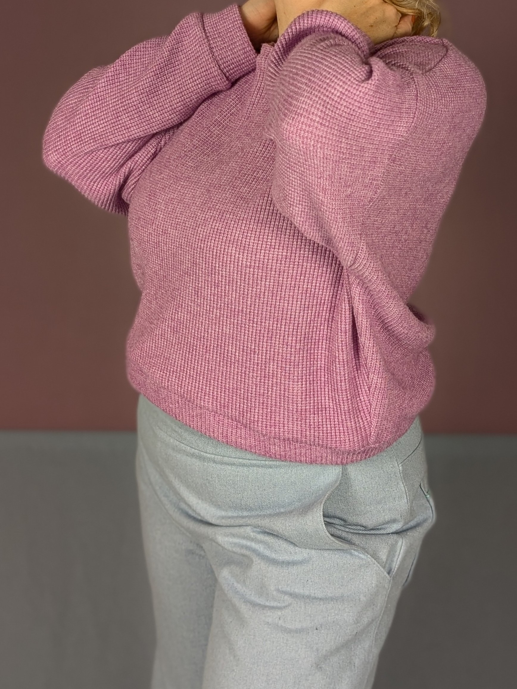 Mit dem Cozy wollten wir einen weiten bequemen Pullover ohne Oversizeoptik, in dem genügend Platz für Schultern, Brust und Oberarme ist und der trotzdem an der Hüfte angenehm anliegt.