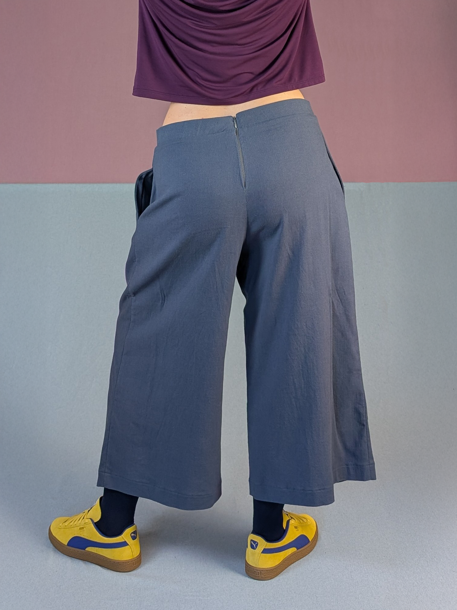 Auch die High Waist Culotte wird hinten geschlossen – so entsteht keine unnötige Enge am Bauch, Stoff und Bund liegen angenehm an.